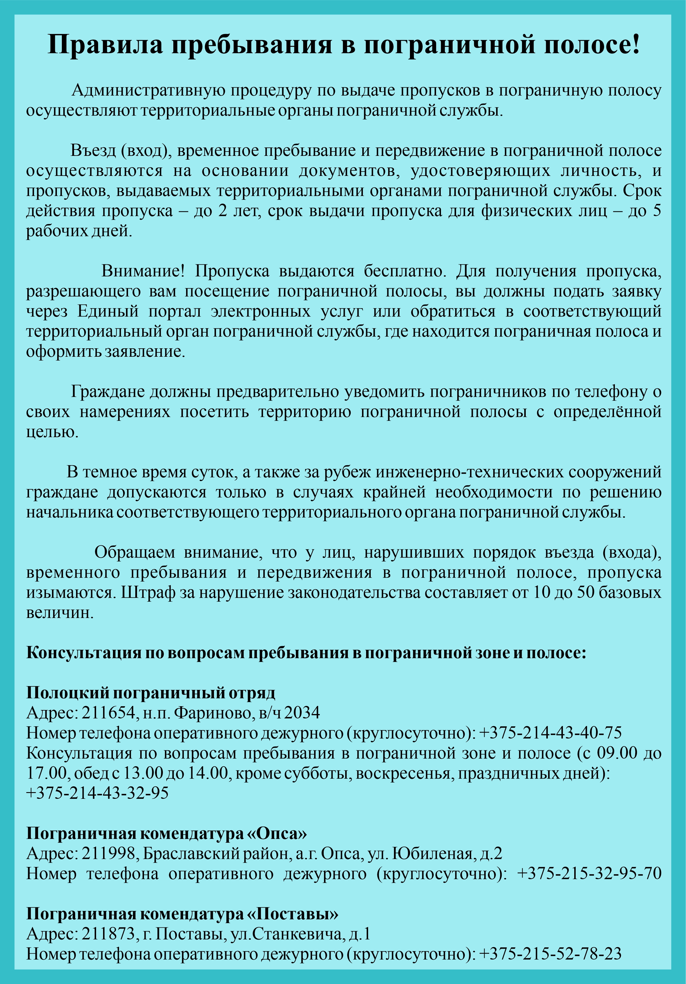 Консультация по вопросам пребывания в пограничной зоне и полосе (с 09.00 до 17.00, обед с 13.00 до 14.00, кроме субботы, воскресенья, праздничных дней): +375-214-43-32-95